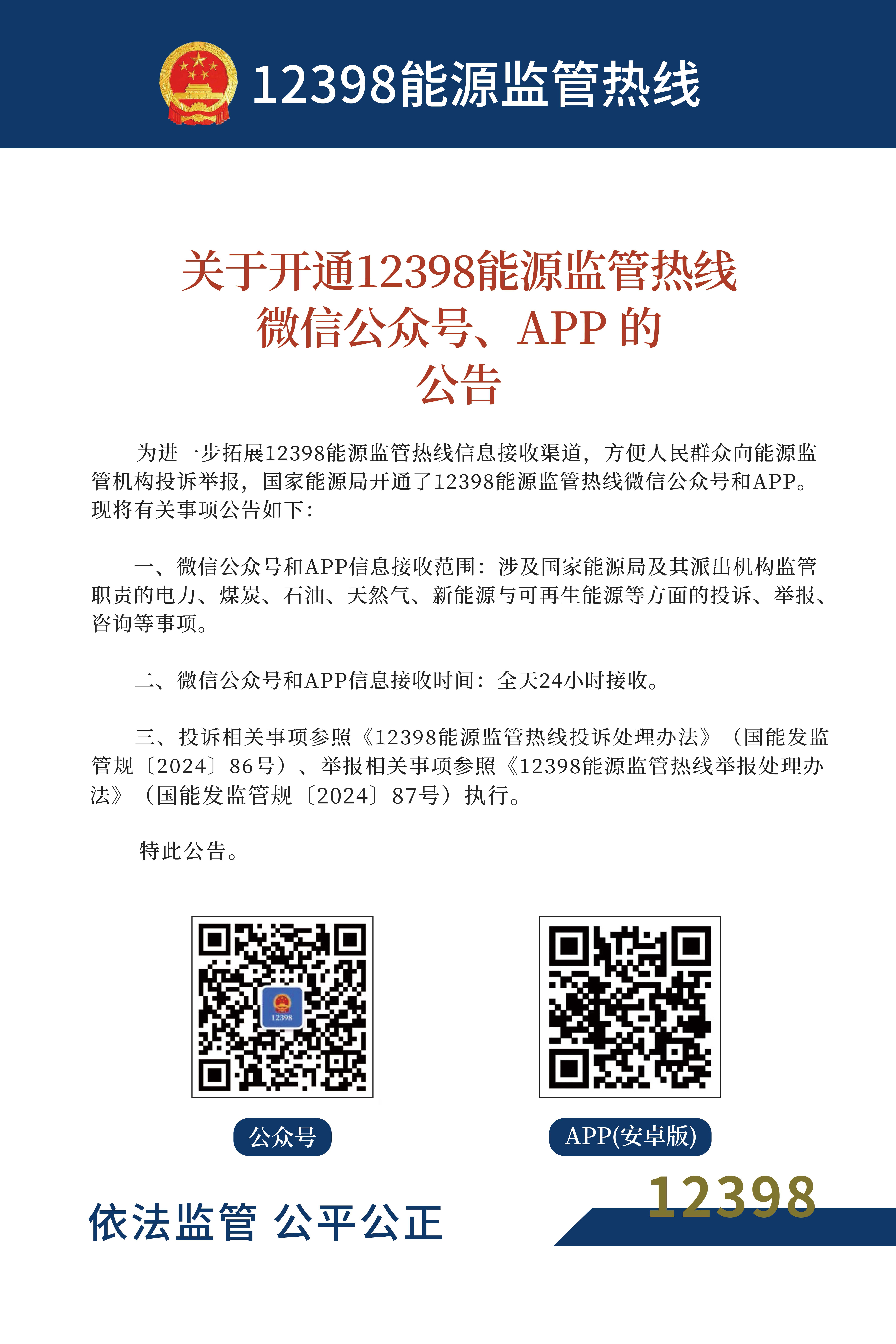 關(guān)于開通12398能源監(jiān)管熱線微信公眾號、APP的公告
